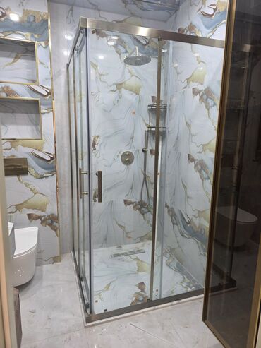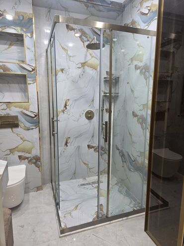 Şüşə duş kabin sistemi - Material: temperli təhlükəsiz şüşə, qumlu/ştrixli mat naxışla məxfilik təmin edir - Konstruksiya: sürüşkən qapılı sistem, alüminium/profil bərkidicilər və paslanmayan fiti...