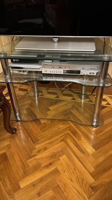 Qara şüşəli TV stendi - Material: qalın temperli qara şüşə rəf, metal konstruksiya - Ölçü (təxmini): 100–110 sm en, 40–45 sm dərinlik, 45–50 sm hündürlük - 2 səviyyəli dizayn: üst səth TV üçün, al...