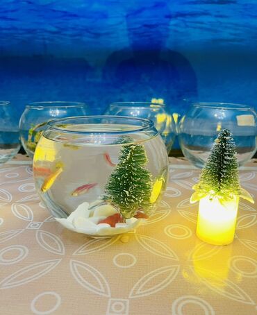 Akvaryum – çoxbucaqlı (panoram) şüşə korpuslu, qara çərçivəli model. Daxilində dekorativ delfin fiqurlu kompozisiya, arxa fon üçün dəniz motivli poster, alt hissədə ot/çəpər görünüşlü dekor mövcudd...