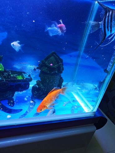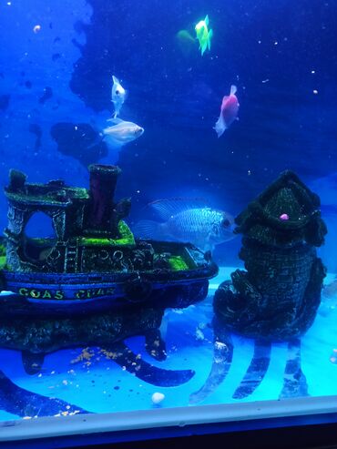 Böyük həcmli şüşə akvarium komplekti. Baliqlarla birge verecem. Her weyi daxil. Etrafli zeng edib maraqlana bilersiz. - Ölçü: təxminən uzun 150–160 sm, hündür 60 sm, dərinlik 40–50 sm (geniş, tam ...