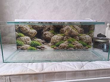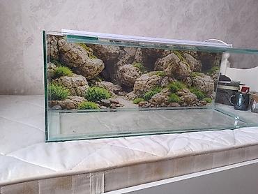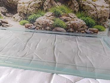 - Arxa fon: daş və yaşıl bitki motivli dekorativ poster, akvariumun arxa divarına bərkidilib.