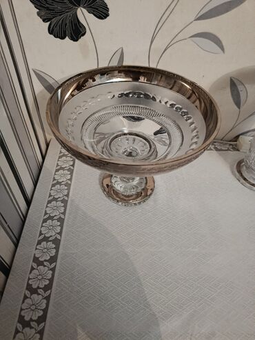 Baku electronicsdan alinib. Teze qutuda. Qızılı bəzəkli şüşə meyvəqabı/servis vazası - Material: qalın, şəffaf şüşə kasa + metalik qızılı tonlarda dekorativ ayaqlıq - Forma: enli, alçaq qab; dalğal...