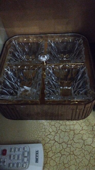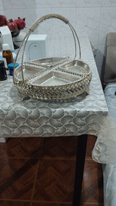 - Komplekt: üzərində daşıma üçün möhkəm qulp olan metal səbət və ayrıca dörd kvadrat şüşə kasa (mərkəzdə dekorativ tutacaq)