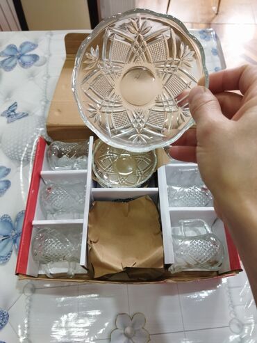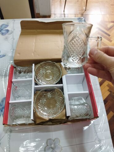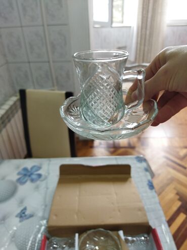 Şüşə fincan dəsti - Material: şəffaf, qalın şüşə - Komplekt: çoxsaylı fincan + iki tip boşqab/nişanlıq altdaş (kvadrat yumru künclü və dairəvi bəzəkli) - Dizayn: fincanın gövdəsində halqavari rely...