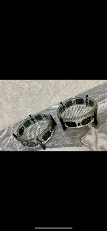 Şüşə şirniyyat qabları (2 ədəd, ayaqlı) - Material: qalın, naxışlı şüşə - Forma: üçbucaqvari kasalı, ayaqlı konstruksiya - Kənarlar: qızılı tonlarda bəzək haşı - Rəng: şəffaf - Dizayn: xırda ornam...