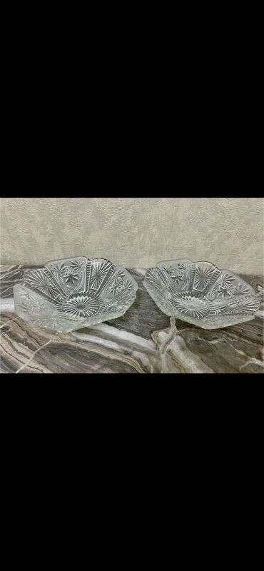 2si 25 azn Kəsmə naxışlı şüşə qab dəsti - Material: qalın, şəffaf şüşə (kristal tipli), dərin kəsimli dekor. - Dəstə daxildir: - 2 ədəd kəsimli vaza – üst hissəsi tac formalı, çoxüzlü naxışlarl...