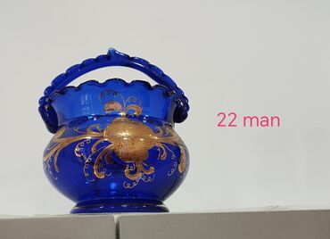 Hamısı təzədir. Qiymətdə endirim olacaq. Göy meyvə vazı və səbət hərəsindən 2 Ədəddir.Kobalt-mavi şüşədən dekorativ səbət. Qabın üstü qızılı naxışlarla bəzədilib, dalğalı ağız kənarı və bükülü qulpu var. Ev dekoru, konfetə uyğundur. Qiymət: 22 AZN (şəkildə göstərilib).