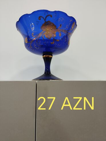 - Kobalt-mavi şüşədən ayaqlı meyvə qabı. Geniş, dalğalı kənarlı kasa hissəsi və qızılı bəzəklər. Süfrə və vitrin üçün Qiymət: 27 AZN (şəkildə göstərilib).