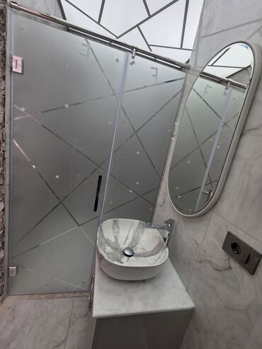 Şüşə duş kabinası və mərmər üslublu lavabo dəsti