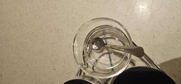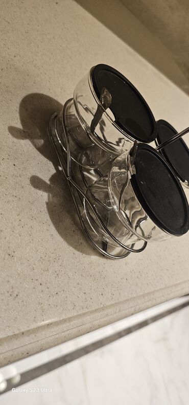 - Material: şəffaf qalın şüşə qablar, paslanmayan metal çərçivə və mərkəzi tutacaq, qara qapaqlar