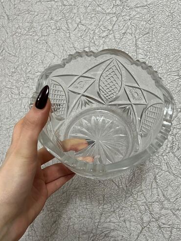 Kəsim naxışlı şüşə/kristal desert qabı - Material: qalın şüşə/kristal tipli - Forma: dairəvi, dalğalı kənarlı - Naxış: klassik kəsim ornamentlər (ulduz və romb motivləri), işığı gözəl əks etdirir ...