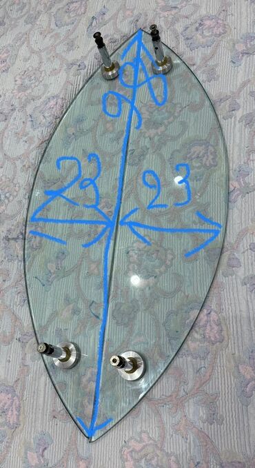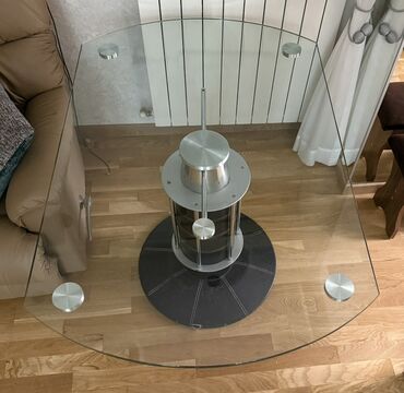 - Masa üstü: şəffaf temperli şüşə, yumşaq künclü üçbucaq/yarımoval forma. Dörd ədəd alüminium rəngli dayağın üzərində quraşdırılır. Mərkəzdə dekorativ metal sütunlu baza görünür.