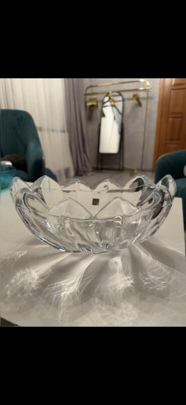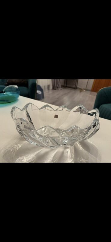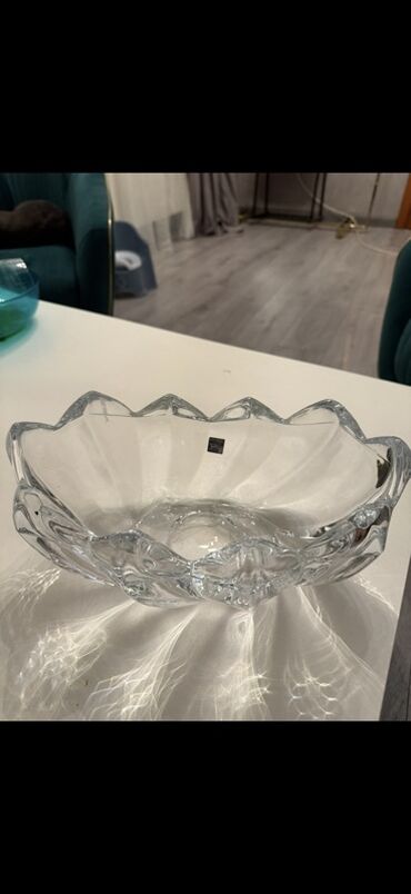 Şüşə meyvə/qəlyanaltı qabı - Material: qalın, şəffaf şüşə - Forma: kvadrat, kənarları yuxarı qalxan dərin kasa forması - Dizayn: iç hissədə relyefli xətli (şəbəkəvari) naxış, mat və parlaq səthlər...