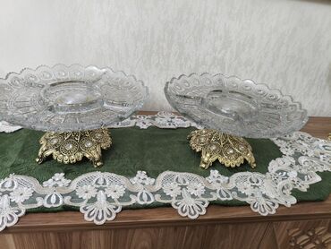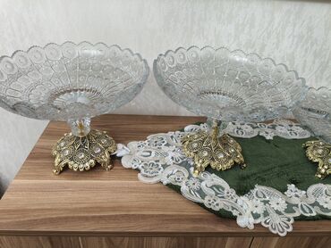 - Material: kəsimli şəffaf şüşə kasa, metal (qızılı rəng) dekorativ ayaq