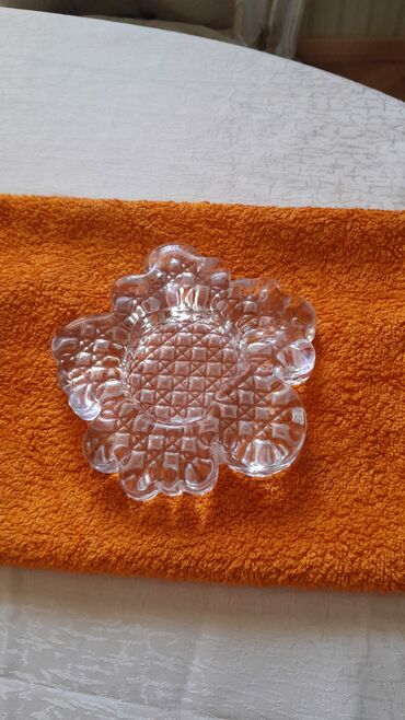 - Çiçək formasında, relyefli naxışlı şəffaf şüşə boşqab. Kiçik şirniyyatlar, qənd və ya qoz-fındıq üçün uyğundur; dekorativ servis kimi də istifadə oluna bilər.