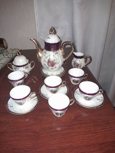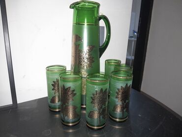 - Yaşıl rəngli sürahi və 6 ədəd stəkandan ibarət içki dəsti. Sürahinin tutacağı möhkəm, qapağı var; stəkanların üzərində qızılı tonlarda günəbaxan motivləri və zərif haşiyələr mövcuddur. Soyuq içkilər, kompot və limonad servisində estetik uyğunlaşma yaradır.