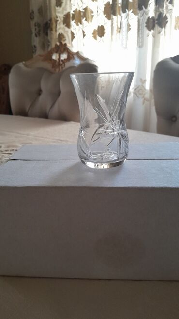 - Kəsim naxışlı klassik stəkan (armudu formalı). Şəffaf şüşə üzərində zərif oyma motivlər çay servisinə zəriflik qatır.