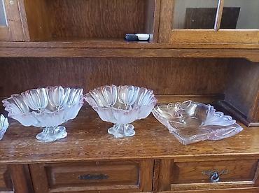 Bəzəkli şüşə qab dəsti.çox böyükdülər .realda qəşəngdilər .baha alının .təzədir .istigadə olunmayıb . - 3 ədəd ayaqlı şüşə qabdan ibarət dəst - 1 ədəd hündür mərkəz qabı və 2 ədəd yan qab - Materi...