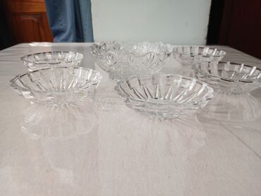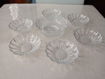 Şüşə qablar dəsti – mavi rəngdə, çiçək formalı - Material: qalın şüşə - Rəng: tünd mavi (transparan) - Dizayn: beş ləçəkli çiçək forması, daxildə yarpaq relyefli naxış, xaricdə incə şaquli xətlər ...