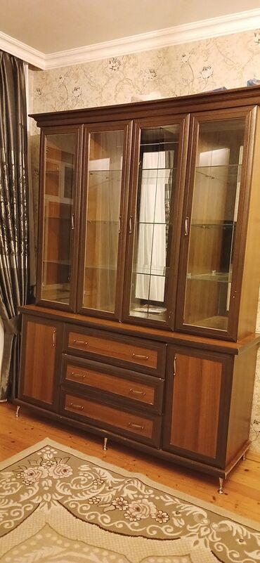 Vitrinli bufet şkaf - Material: ağac (tünd qəhvəyi ton), klassik dizayn - Ön hissə: iki ədəd şüşəli qapı, dekorativ metal tutacaqlar - Daxili quruluş: bir neçə rəf – qab-qacaq, suvenir, saat və di...