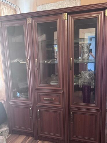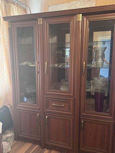 - Orta bölmə: yuxarıda şüşə vitrin, ortada kiçik çekmece, aşağıda qapalı dolab