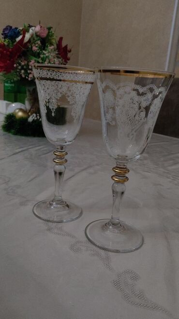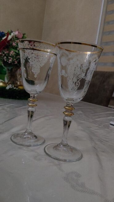 Qızılı naxışlı şərab üçün zərif, nazik ayaqlı stəkanlar dəsti. Hər bir stəkan qızılı zolaqlar və bəzəkli naxışlarla bəzədilib, xüsusi günlər və ya qonaq qəbulu üçün ideal seçimdir.Hündürlüyü 18 sm....