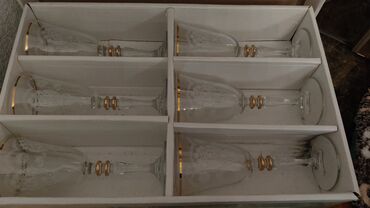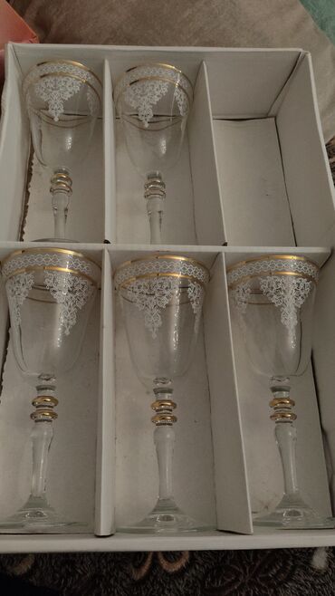 Qızılı naxışlı şərab üçün 6 ədəd zərif qədəhlər dəsti. Hər bir qədəh zərif ayaqcıqlara və qızılı rəngli bəzəklərə malikdir. Şərab içmək üçün gözəl seçimdir.Hündürlüyü 16 sm.Az işlənib