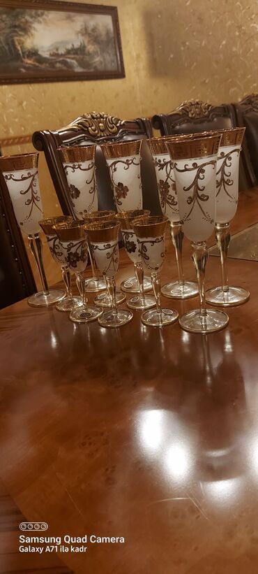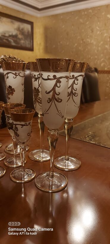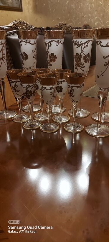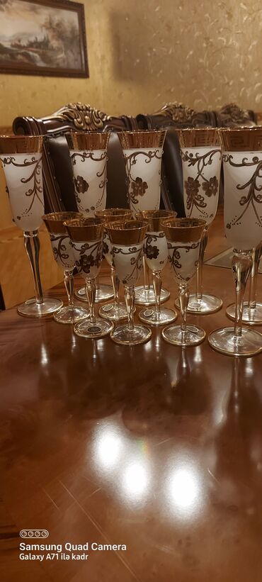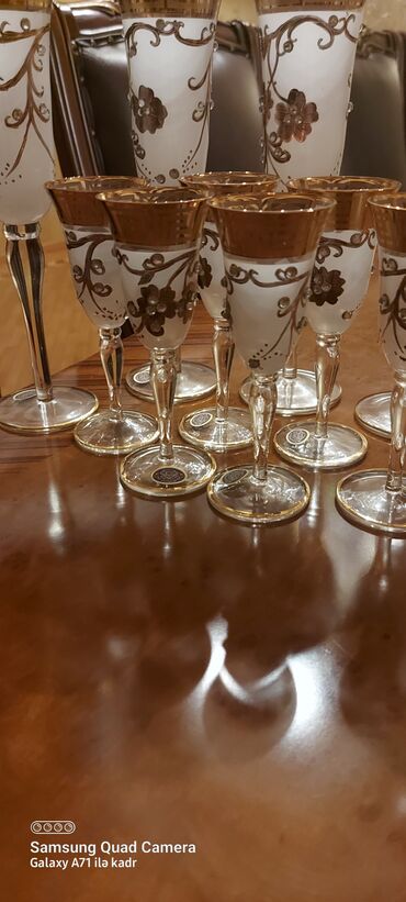 Şüşə qədəh dəsti – 12ədəd - Material: Şüşə gövdə, üst hissə süd rəngli/opak şüşə - Dizayn: Qızılı naxışlı klassik ornamentlər və iri çiçək motivləri, kənarları qızılı haşiyə - Ayaq və oturacaq: Şə...