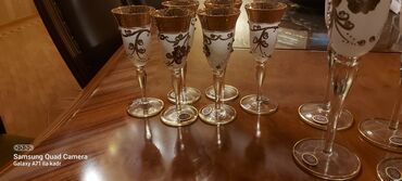 Şüşə qədəhlər dəsti - Sayı: 12 ədəd - Material: şəffaf şüşə - Dizayn: zərif naxışlı şeritlər və yuxarı kənarda qızılı haşiyə - Forma: qısa gövdəli, enli kasa – likör, desert şərabı, kompot və ya x...