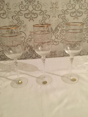 - 3 ədəd hündür şərab/qırmızı şərab qədəhi: nazik, bükülü (spiral) ayaq, kasada şəffaf ornamentli mat naxışlar və üst hissədə 3 ədəd qızılı halqa. Hər birinin dibində istehsalçı etiketli.