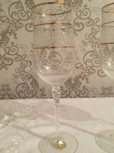 Klassik şüşə qade dəsti - Material: şəffaf şüşə/kristal - Komplekt: • 3 ədəd uzun ayaqlı qədəh – bədii ornamentli, üst hissədə 3 ədəd qızılı xətt, bükülü (spiral) formalı ayaq. • 6 ədəd nazi...