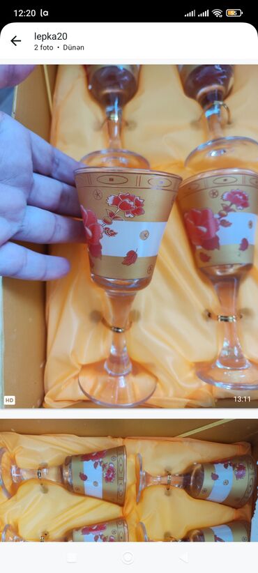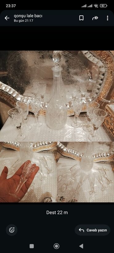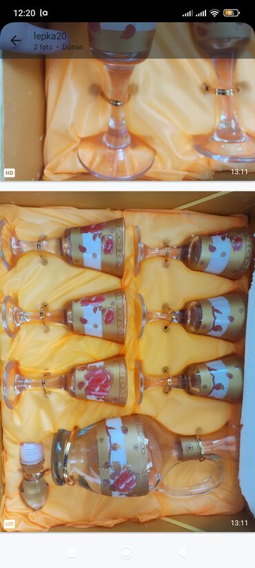 Məhsul: Şüşə qədəh və qrafin dəstləri 1) Qızılı naxışlı su/qonaqlıq dəsti - 1,5 litrlik qrafin (dolça) - 6 ədəd balon formalı qədəh - Şüşə üzərində qızılı haşiyə və oyma naxışlar - Mətn: “Təzədi, ...