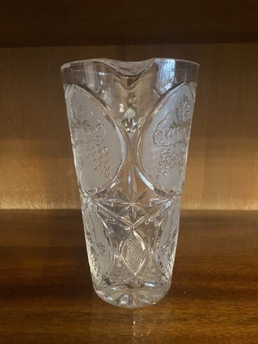Şüşə sulayıcı – kristal naxışlı - Material: şəffaf şüşə - Tərtibat: klassik kəsim-naqışlı ornamentlər (ulduz və romb motivləri) - Quruluş: konus formalı əsas hissə və yan tərəfdən əyilmiş, dar çıx...
