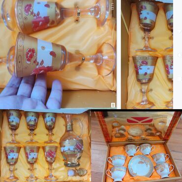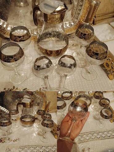 Məhsul: Şüşə qədəh və qrafin dəstləri 1) Qızılı naxışlı su/qonaqlıq dəsti - 1,5 litrlik qrafin (dolça) - 6 ədəd balon formalı qədəh - Şüşə üzərində qızılı haşiyə və oyma naxışlar - Mətn: “Təzədi, ...