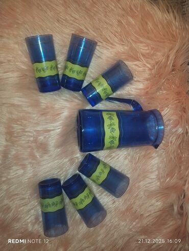 Mavi sürahi və stəkan dəsti - Dəst tərkibi: 1 ədəd sürahi + 6 ədəd stəkan - Material: rəngli şüşə/plastik görünümlü qalın material - Rəng: kobalt-mavi - Dizayn: stəkanların və sürahinin üzərində z...