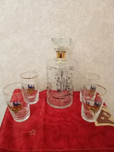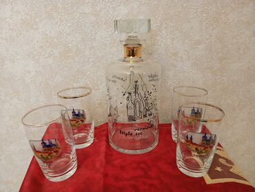 Material: şəffaf qalın şüşə. Qrafin qapaqlı, sızmanı önləyən rezin/şüşə birləşməli. Stəkanlar qısa (old fashioned tipli). Ev barı, likör və kokteyl təqdimatı üçün uyğundur, hədiyyəlik dekorativ görünüşə malikdir. Dəst bütövdür: 1 qrafin + 4 stəkan.