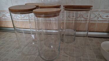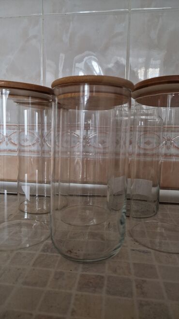 Şüşə saxlama qabları, şəffaf, şüşə korpuslu, bambuk/taxta qapaqı, silikon halqa ilə sıx bağlanma üçün. silindrik, hündür 24×11 sm.Qoxu götürmür, asan görmək üçün tam şəffaf, hava keçirməyən qapanm...