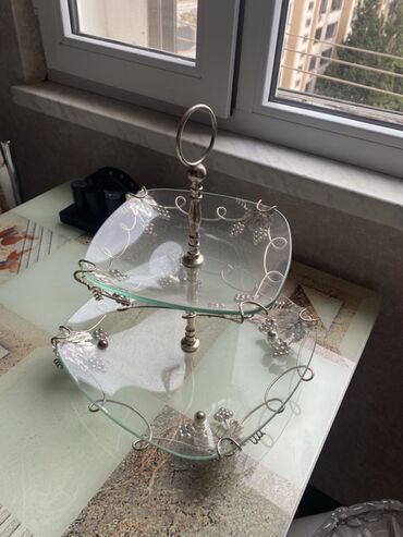 - 1 ədəd iki mərtəbəli desert/şirniyyat stendi: dairəvi tutacaqlı mərkəzi metal sütun, iki şüşə boşqab, kənarlarda metal üzüm salxımı və yarpaq dekoru; şirniyyat, meyvə, kanape və qurabiyələr üçün ideal vitrin görünüşü.