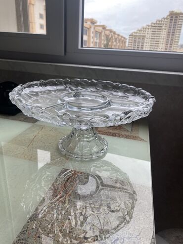 - 1 ədəd ayaqlı iri meyvə/gülab atma qabı: qalın şüşədən, dərin kasalı, üzərində kəsim naxışlar, kvadrat baza üzərində möhkəm dayaq.