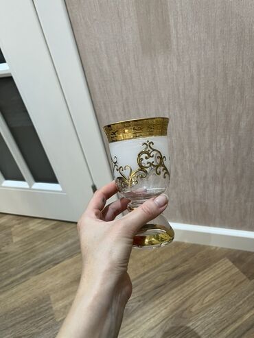 - Qədəhlər: çevrilmiş konus formalı ayaq, yuxarı hissədə geniş qızılı bordür, dekorativ medalyon və naxışlar