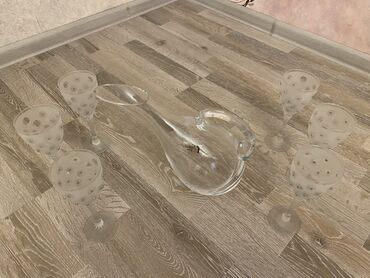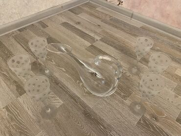 5 eded stekandi..1qrafinkasi...yenidi isdifade olunmayib...Şəffaf şüşədən hazırlanmış, üzərində buzlanmış effekti və bəzəkli detalları olan bir stəkan dəsti. Dəstə qulplu bardaq və uyğun stəkanlar ...