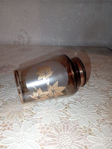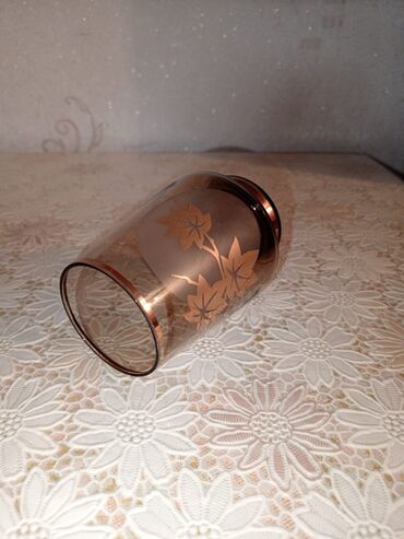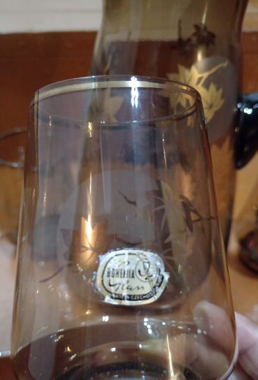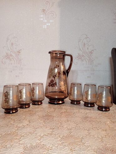 Qrafin desti. 5 stekanla. Konyaçniy dest. Mat üzerinde qizili işlemelerle. Qrafinin hundurluyu 18 sm, stopkasinin hundurluyu 6 sm. Kocurul deye coxlu sayda metbex levazimatlari, qab-qacaq, deyer-de...