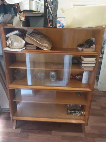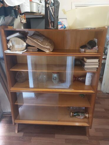 Taxta kitab rəfi və şkaf kombinasiyası - Material: laminat/taxta kompozit, qırmızı-qəhvəyi rəng - Üst hissə: 2 açıq rəf – kitab, dekor, aksesuar və gündəlik əşyalar üçün - Orta hissə: geniş açıq s...