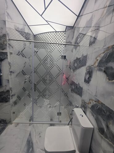 Şüşə duş kabinası və mərmər üslublu lavabo dəsti - Duş kabinası: mat (qumlanmış) şüşə panellər, dekorativ xətt və fiqur naxışları; sürgülü sistemli paslanmaz metal rels; gizli mexanizmlər; kvadrat...