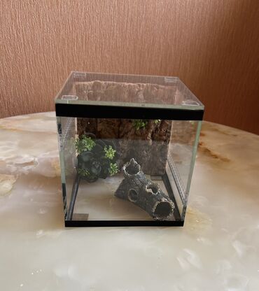 Şüşə terrarium hörümçəklər, eqrebler ve bocekler üçün uyğundur. Şəffaf şüşə hər tərəfdən aydın görünüş təmin edir. Terrariumun yan hissəlerinde havalandırma üçün xüsusi boşluqlar mövcuddur. Aşağı hissədə qara haşiyə dizaynı vardır. Ölçü 15/15/15sm , arxa fonlu ve ya boş satilir