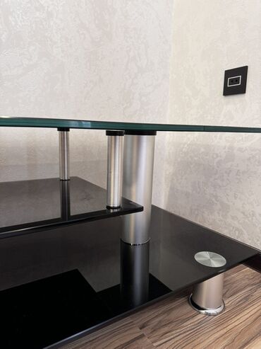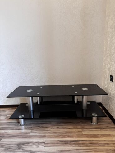 Televizor altlığı – qara şüşə və metal kombinasiyası - Dizayn: Parlaq qara temperli şüşə üstlük, yanlarda möhkəm metal sütunlar, gümüşü dekorativ bərkidicilər. - Rəflər: Üst tablo + 2 orta rəf + a...