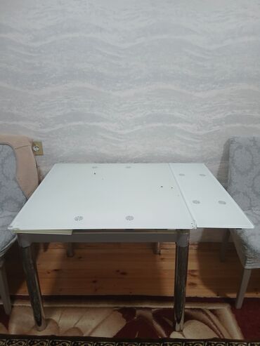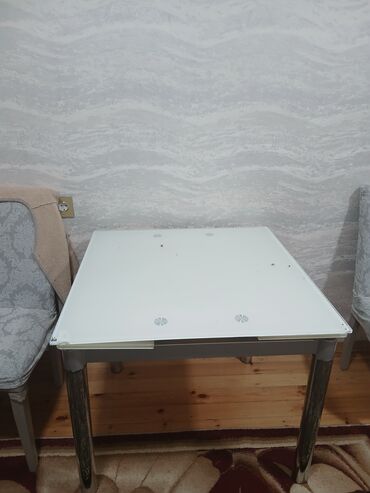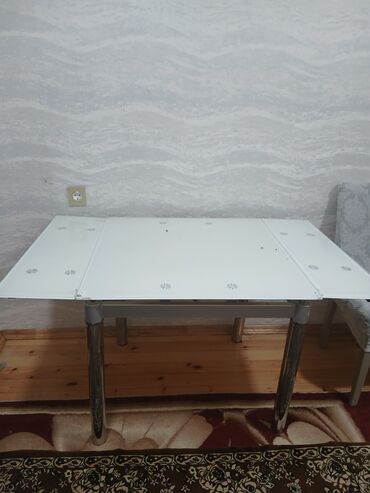 - Material: Ağ rəngli temperli şüşə masaüstü, metal karkas və xromaya bənzər metal ayaqlar.