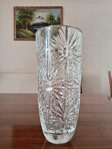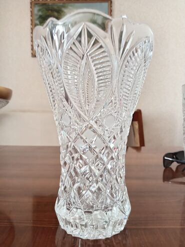 Kolleksiya üçün zərif şüşə/crystal dəst - 1 ədəd hündür vaza: konus formalı, genişlənən ağız, qalın altlıq. Bütün səth boyunca dərin, əl işi tipli kəsmələr – ulduz, romb və xətlərdən ibarət orname...