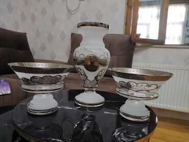 BohemiyaBu dəstə şüşə vaza və iki kasadan ibarətdir. Hər bir elementin səthində qızılı və qara rənglərdə naxışlar var. Vaza və kasaların səthi tutqun görünüşə malikdir. Bu dəst ev dekorasiyası üçün uyğundur.əla vəziyyətdə