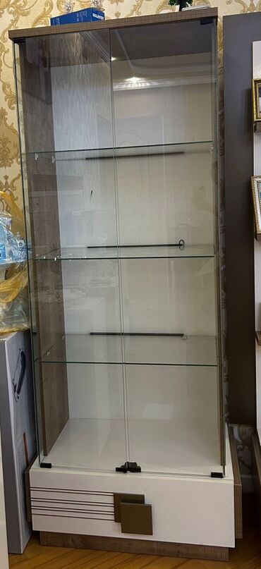 Şüşə vitrin dolabı - Material: ağ-qara korpus, temperli şüşə ön qapılar və rəflər - Ölçü: təxmini 2 m hündürlük, 1,2–1,4 m en (vizual olaraq) - Daxili quruluş: 3 ədəd tam şüşə rəf, yüksək qab-qaca...
